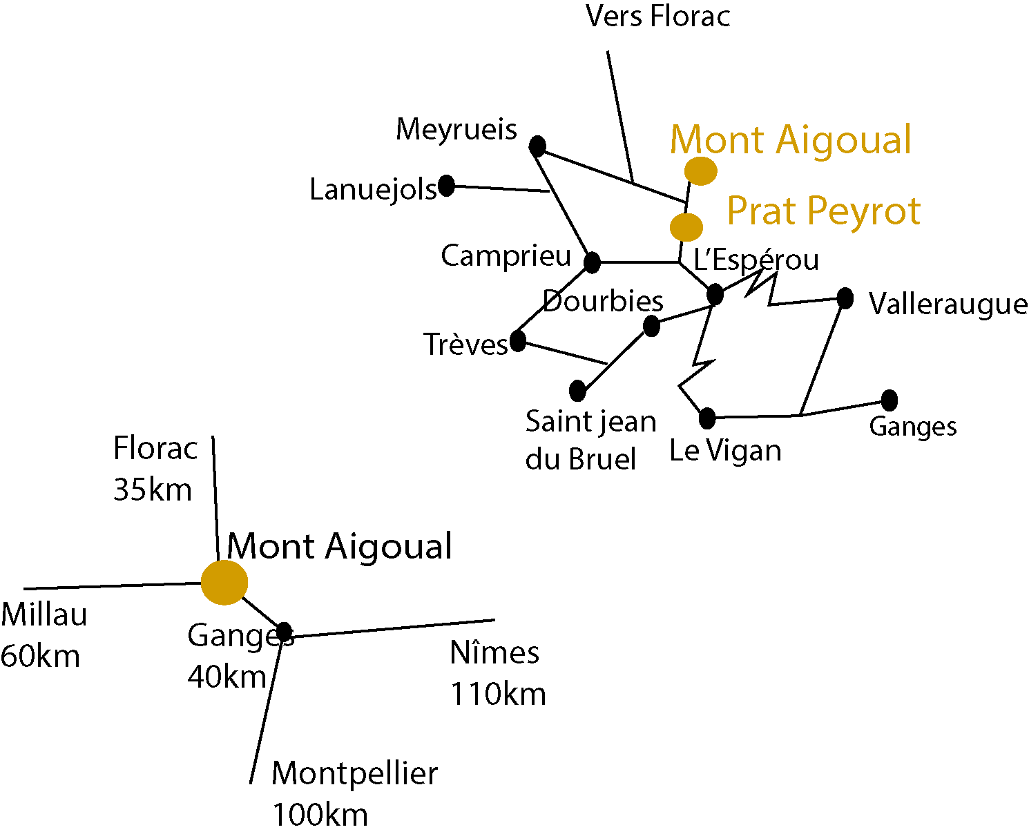 - > En venant de Béziers, Sète, Clermont l'Hérault, Lodève, prendre l'A75, sortir au Caylar, La Couvertoirade, puis Saint jean du Bruel, Dourbies, l'Espérou